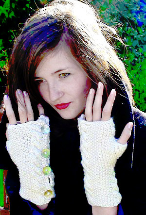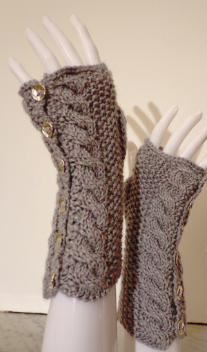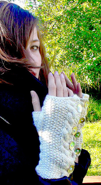 Cables always look so amazing. The all-over cable pattern and moss-stitch lends simplicity to the design and adds extra warmth. The gloves are worked to and fro’ on single pointed needles and the seams are closed simply by attaching beautiful mother-of-pearl buttons.